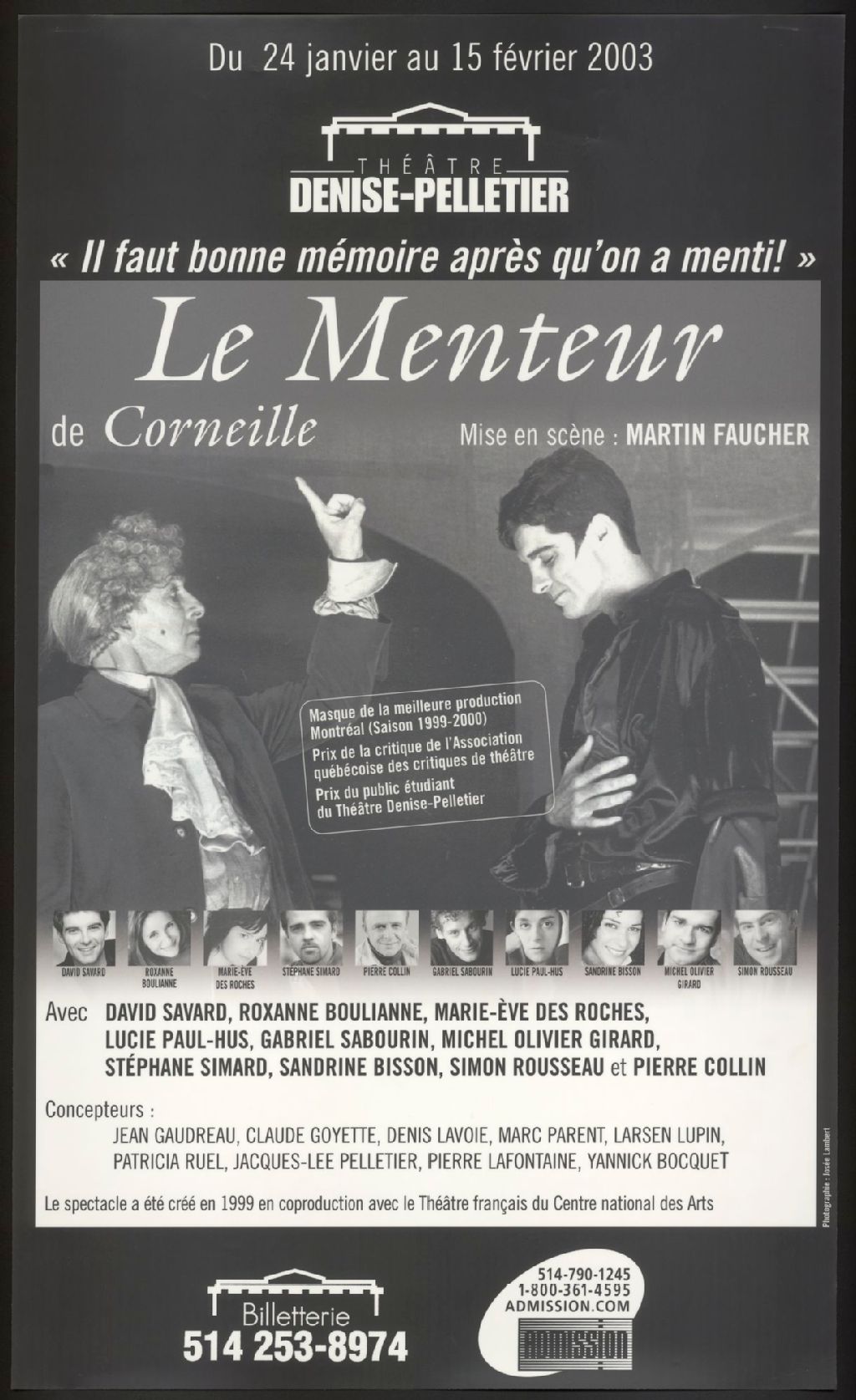 Le menteur, de Corneille, mise en scène Martin Faucher Masque de la meilleure production Montréal (saison 1999-2000), Prix de la critique de l'Association québécoise des critiques de théâtre, Prix du public étudiant du Théâtre Denise-Pelletier