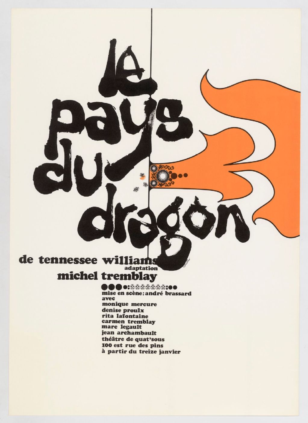 Le pays du dragon, de Tennessee Williams, adaptation Michel Tremblay : mise en scène André Brassard, avec Monique Mercure, Denise Proulx, Rita Lafontaine ... : Théâtre de Quat'sous, 100 Est, rue des Pins, à partir du treize janvier /