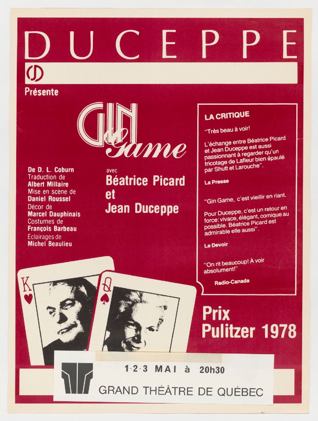 Duceppe présente Gin game, de D.L. Coburn... mise en scène de Daniel Roussel Prix Pulitzer 1978