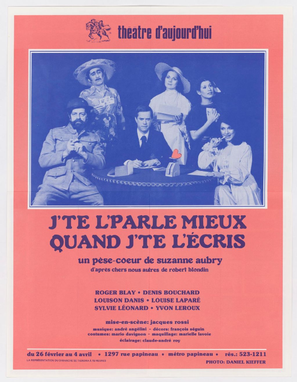 J'te l'parle mieux quand j'te l'écris, un pèse-coeur de Suzanne Aubry, d'après Chers nous autres, de Robert Blondin, mise-en-scène Jacques Rossi