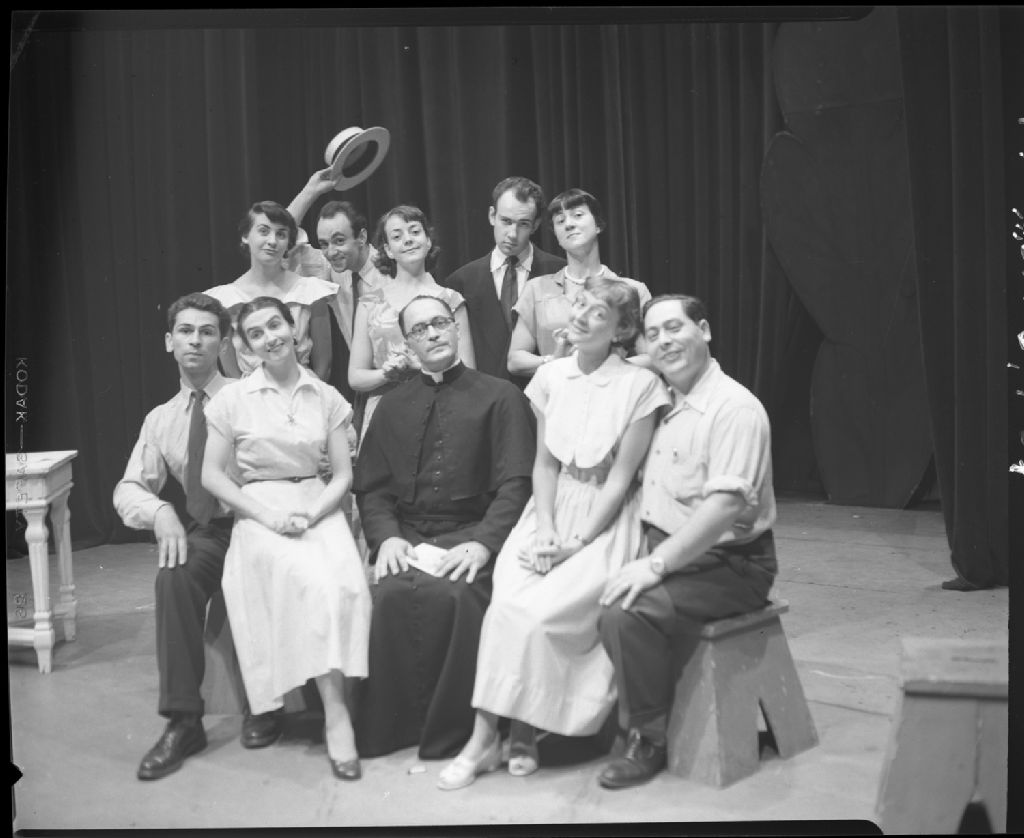 Le père Émile Legault avec des membres de la troupe Les Compagnons de Saint-Laurent, 1950, Archives nationales à Québec, Fonds Lida Moser, (03Q,P728,S1,D2,P16-37), Lida Moser.