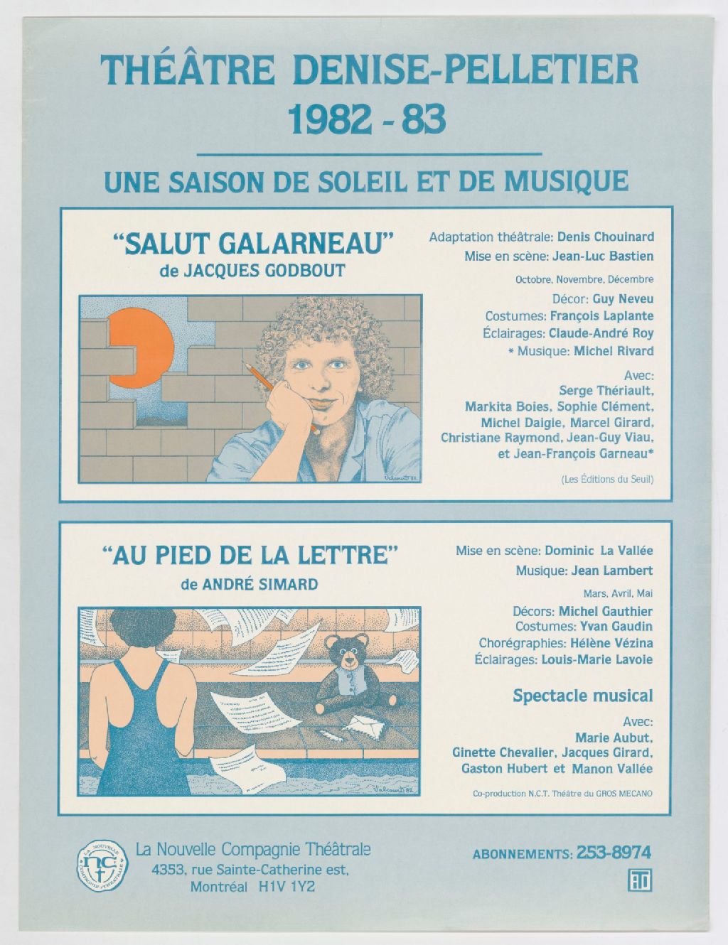 Théâtre Denise-Pelletier, 1982-83, une saison de soleil et de musique Salut Galarneau, de Jacques Godbout ... Au pied de la lettre, de André Simard ...