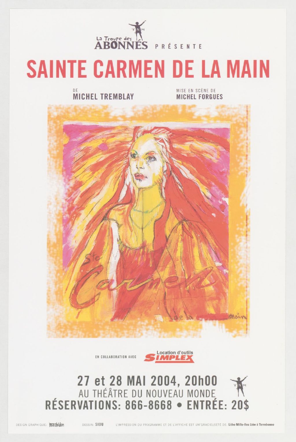 La Troupe des Abonnés présente Sainte Carmen de la Main, de Michel Tremblay, mise en scène de Michel Forgues : 27 et 28 mai 2004, 20h00, au Théâtre du Nouveau Monde /