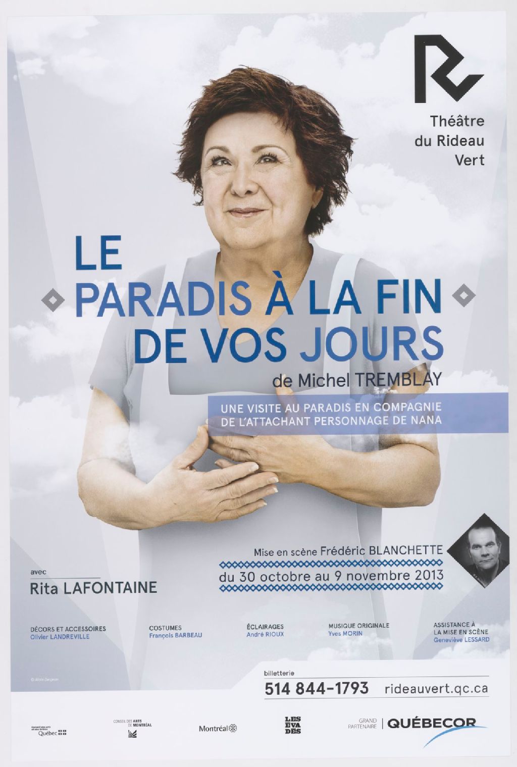 Le paradis à la fin de vos jours, de Michel Tremblay : une visite au paradis en compagnie de l'attachant personnage de Nana : avec Rita Lafontaine, mise en scène Frédéric Blanchette, du 30 octobre au 9 novembre 2013