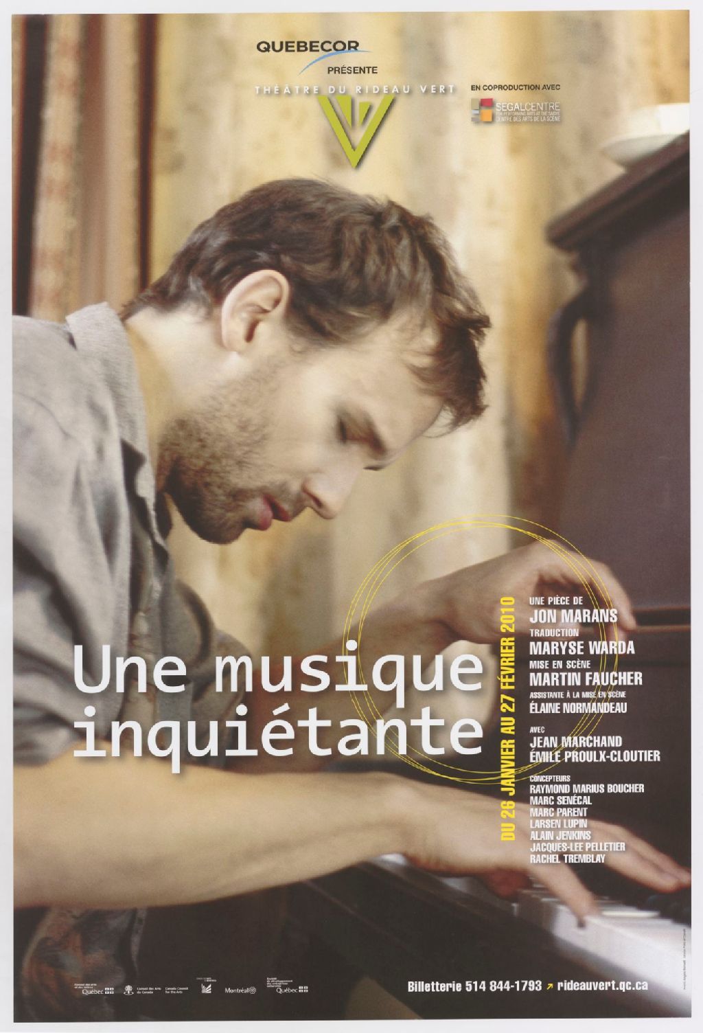 Théâtre du rideau vert, en coproduction avec Segal Centre ... Une musique inquiétante, une pièce de Jon Marans ... avec Jean Marchand, Émile Proulx-Cloutier ...
