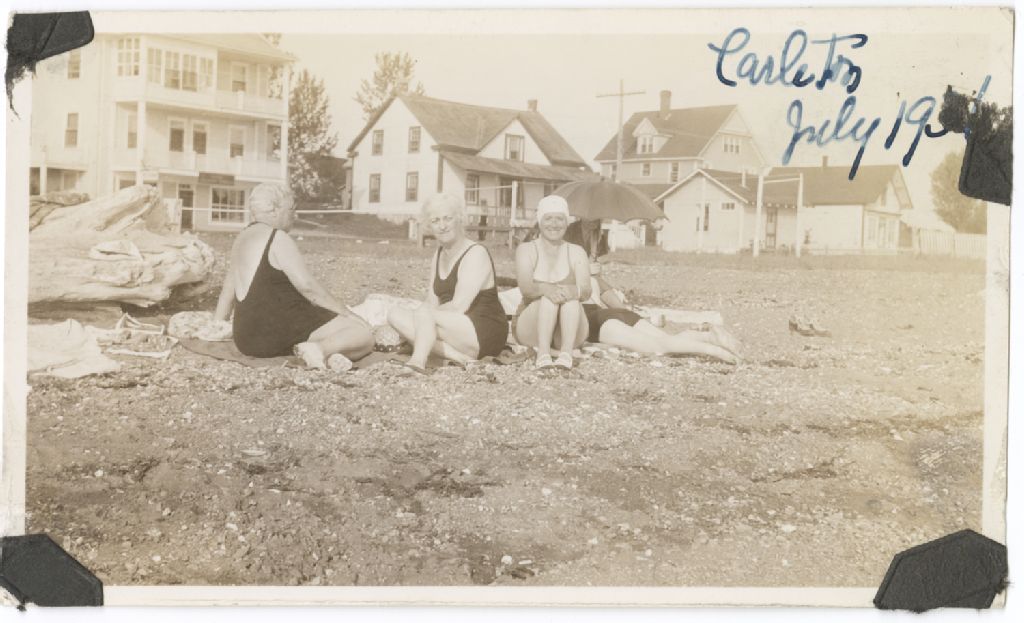 Femmes sur la plage, à Carleton, Juillet 1936, Archives nationales à Québec, Fonds Norma Lee, (03Q,P523,D3,P8), Photographe non identifié.