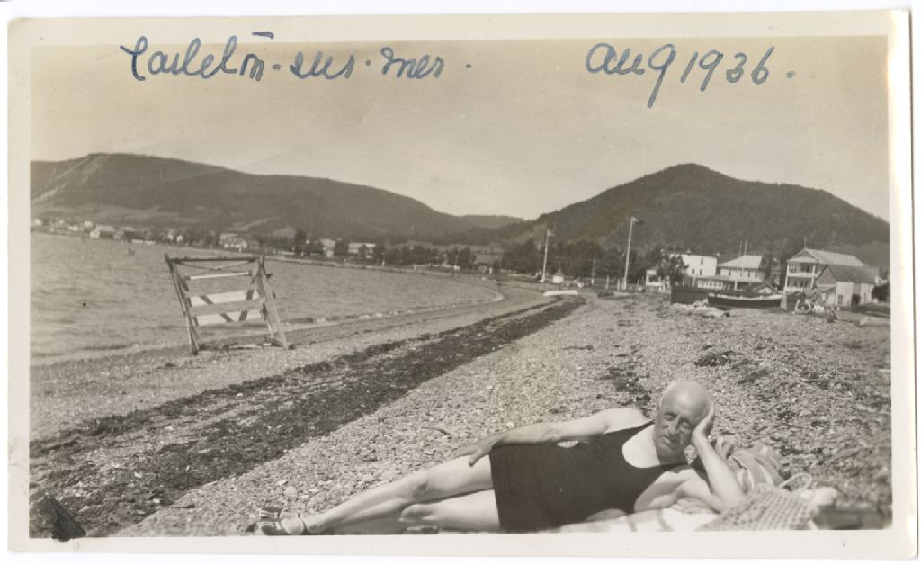 Homme sur la plage, à Carleton, Août 1936, Archives nationales à Québec, Fonds Norma Lee, (03Q,P523,D3,P9), Photographe non identifié.