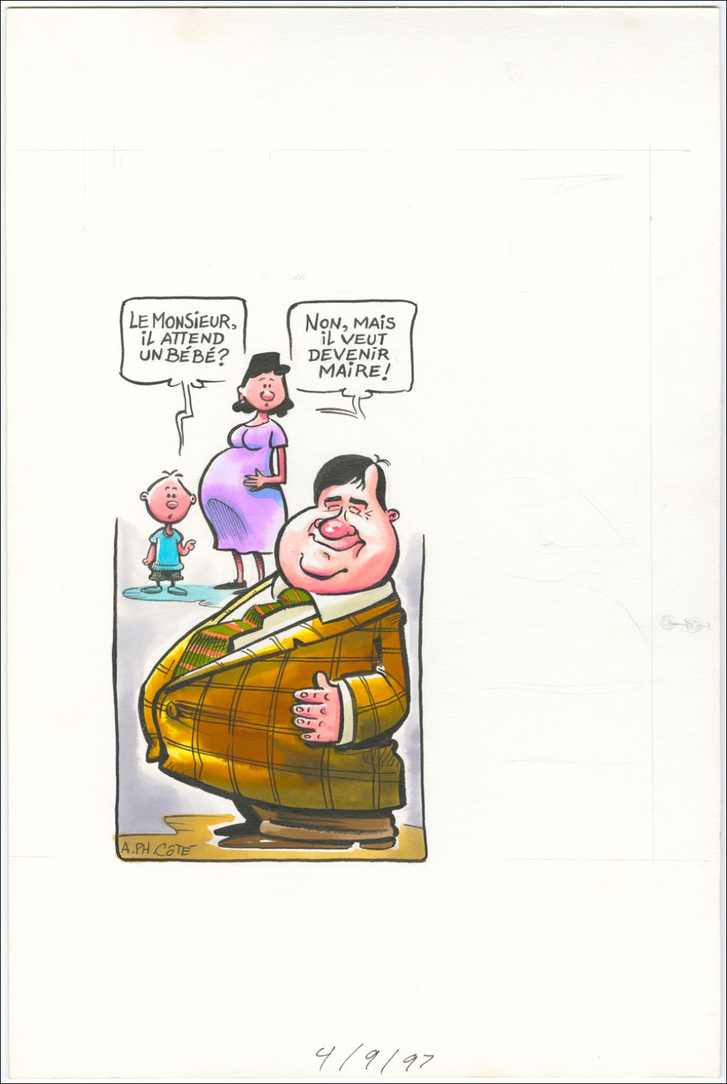[Jeune enfant] : « Le Monsieur, il attend un bébé ? ». [Mère enceinte] : « Non, mais il veut devenir maire ! » [Jean Garon est à l'avant plan et a un ventre aussi gros que la femme enceinte], 4 septembre 1997, Archives nationales à Québec, Fonds André-Philippe Côté, (03Q,P687,S1,P97-09-04-1), André-Philippe Côté.