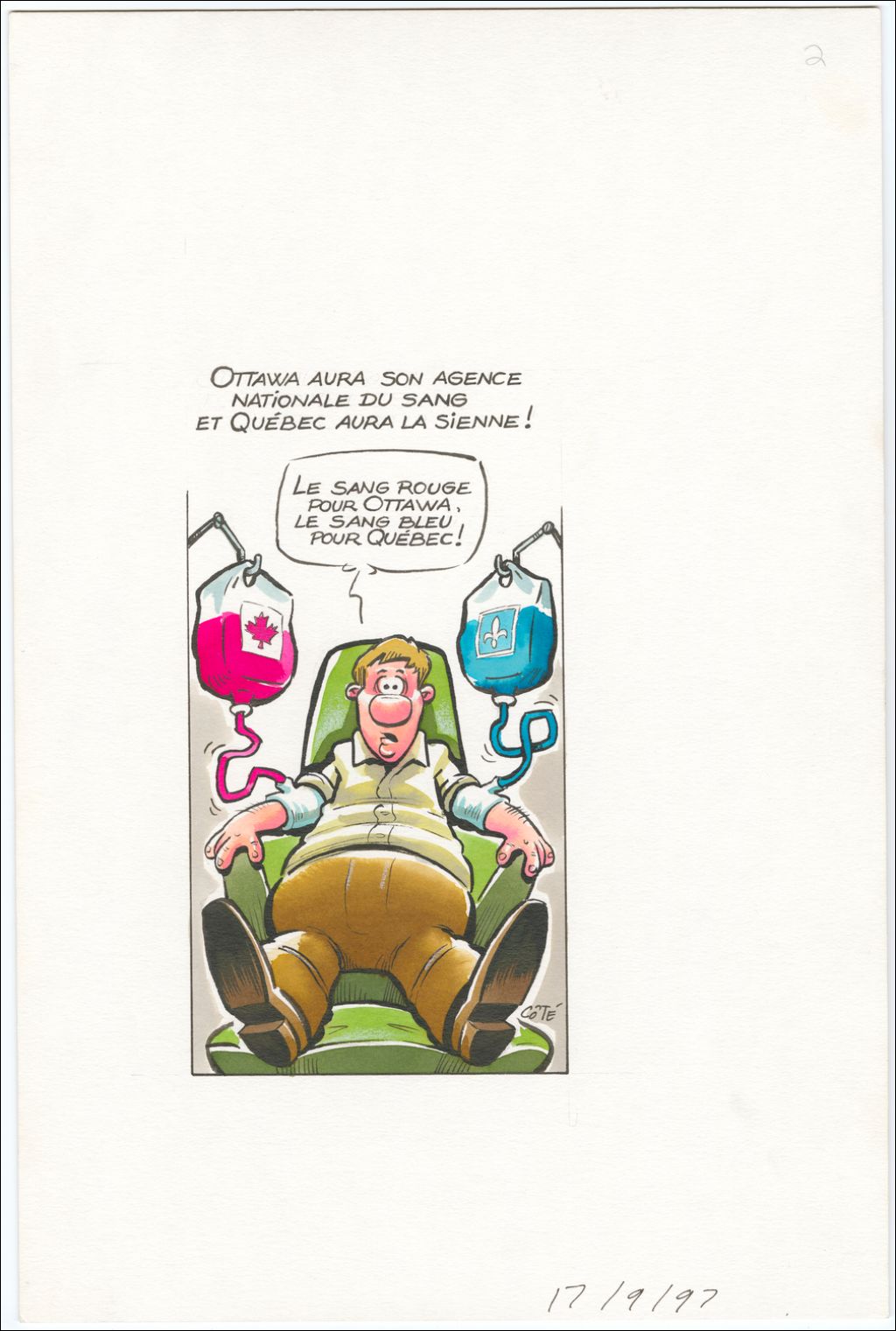 Ottawa aura son agence nationale du sang et Québec aura la sienne ! [Homme assis entrain se faire transfuser du sang rouge et du sang bleu] : « Le sang rouge pour Ottawa, le sang bleu pour Québec ! »