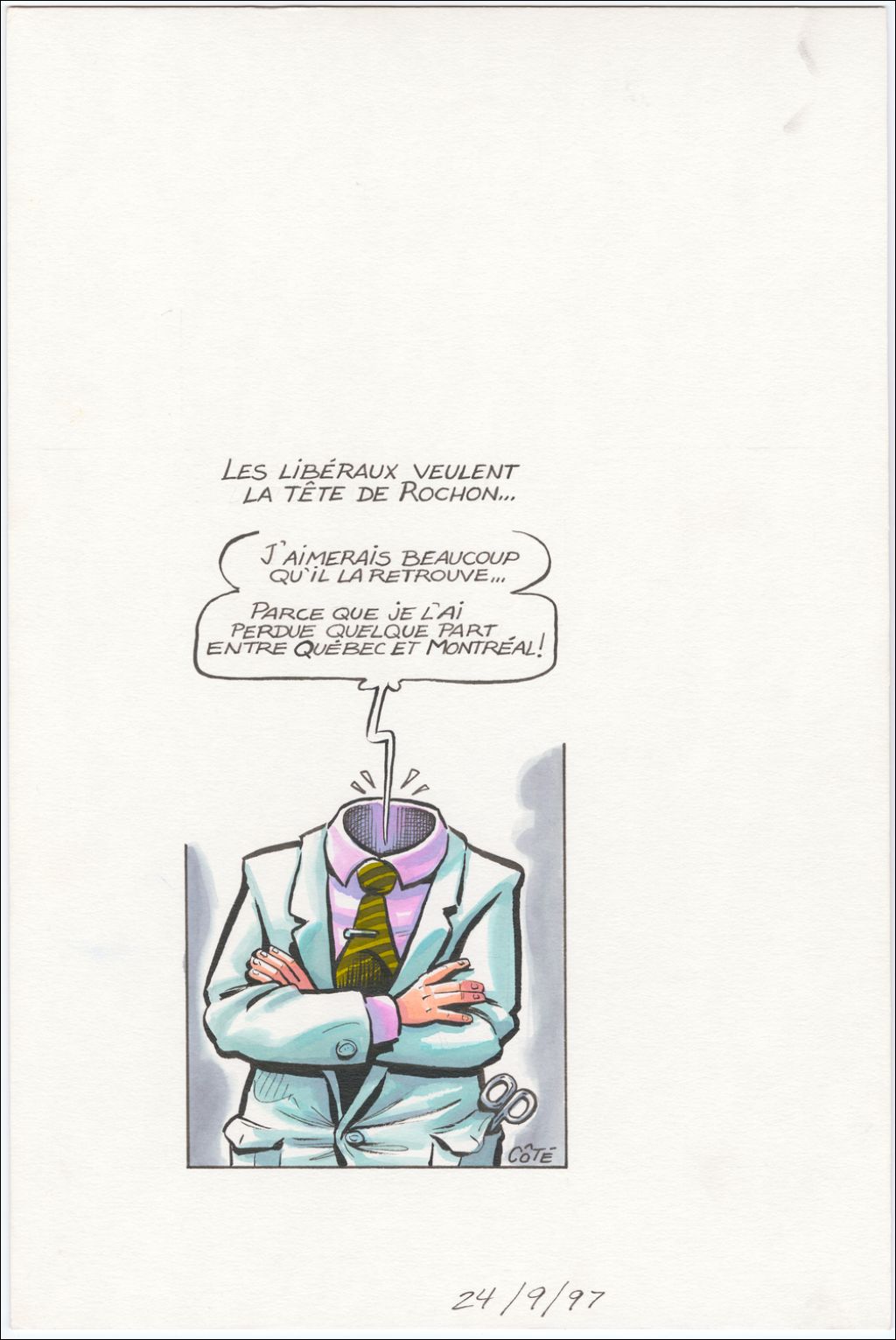 Les libéraux veulent la tête de Rochon... [Jean Rochon] : « J'aimerais beaucoup qu'il la retrouve… parce que je l'ai perdue quelque part entre Québec et Montréal ! », 24 septembre 1997, Archives nationales à Québec, Fonds André-Philippe Côté, (03Q,P687,S1,P97-09-24), André-Philippe Côté.