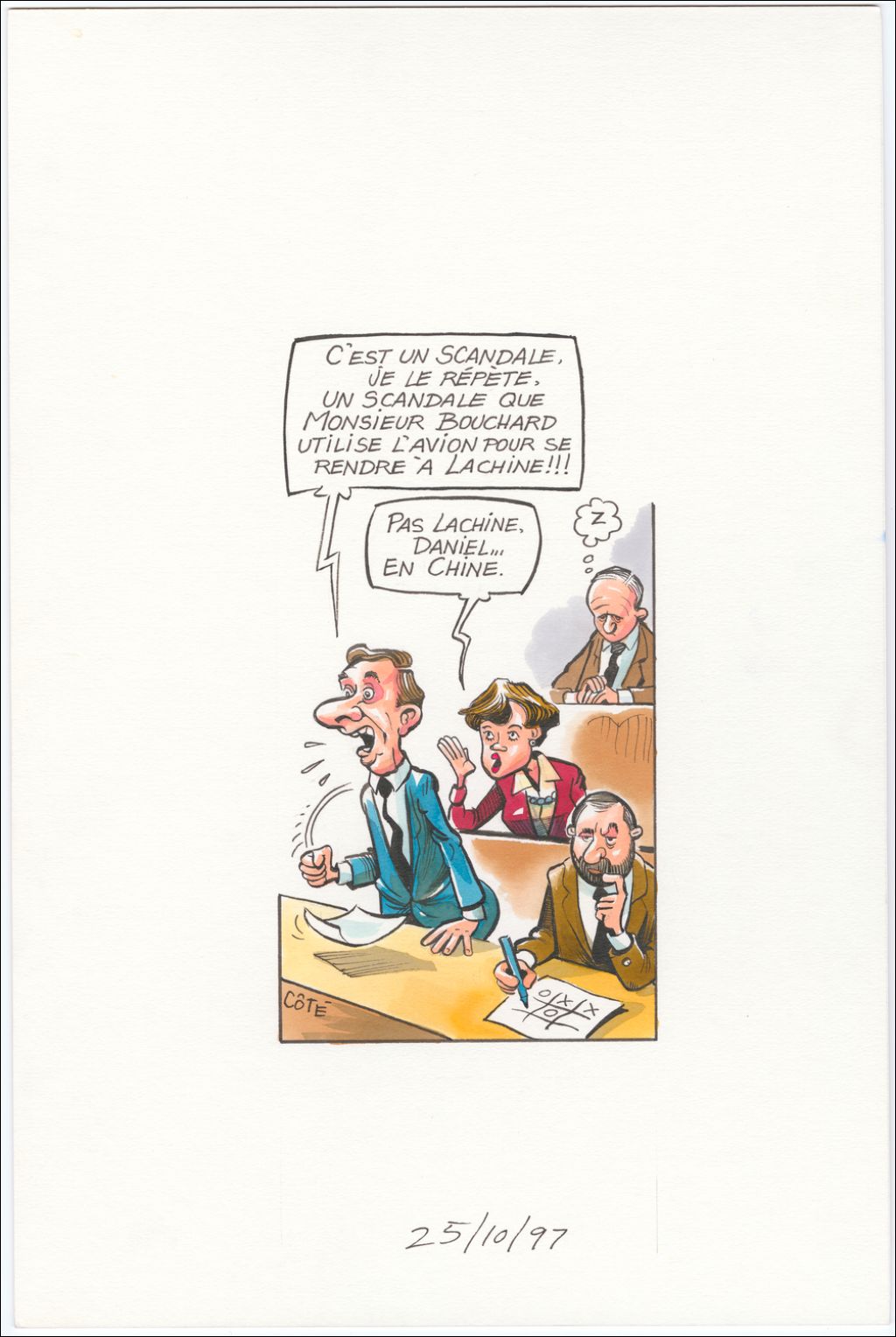 [Daniel Johnson] : « C'est un scandale, je le répète, un scandale que monsieur Bouchard utilise l'avion pour se rendre à Lachine !!! » [Liza Frulla] : « Pas Lachine, Daniel… en Chine. » [Thomas Mulcair joue au tic-tac-toe], 25 octobre 1997, Archives nationales à Québec, Fonds André-Philippe Côté, (03Q,P687,S1,P97-10-25-1), André-Philippe Côté.