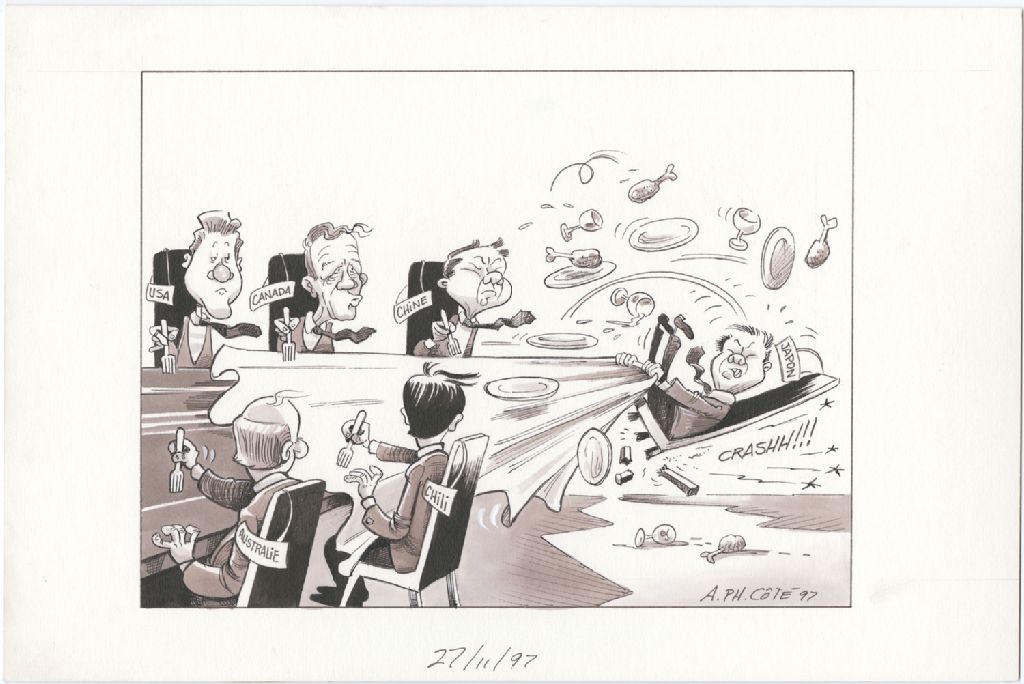 Les "leaders" politiques des États-Unis, du Canada, de la Chine de l'Australie, du Chili et du Japon sont autours de la table et se prépare à manger quand la chaise du leader du Japon se casse et celui-ci tire la nappe dans sa chute