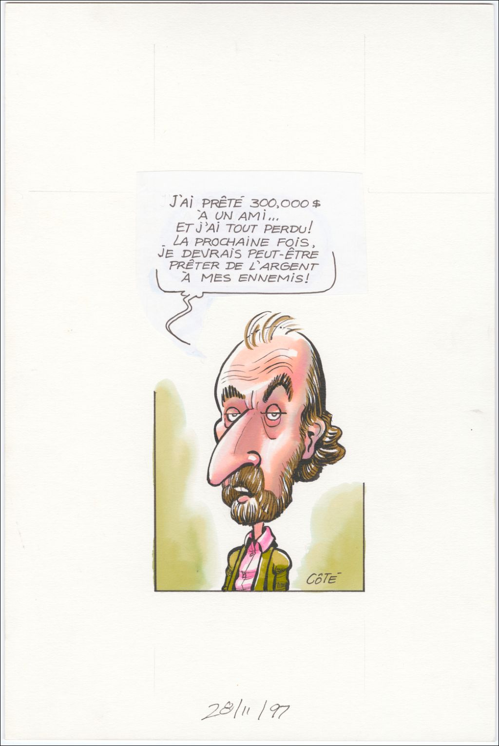 [Gérald Larose] : "J'ai prêté 300,000$ à un ami… Et j'ai tout perdu! La prochaine fois, je devrais peut-être prêter de l'argent è mes ennemis!", 28 novembre 1997, Archives nationales à Québec, Fonds André-Philippe Côté, (03Q,P687,S1,P97-11-28-3), André-Philippe Côté.
