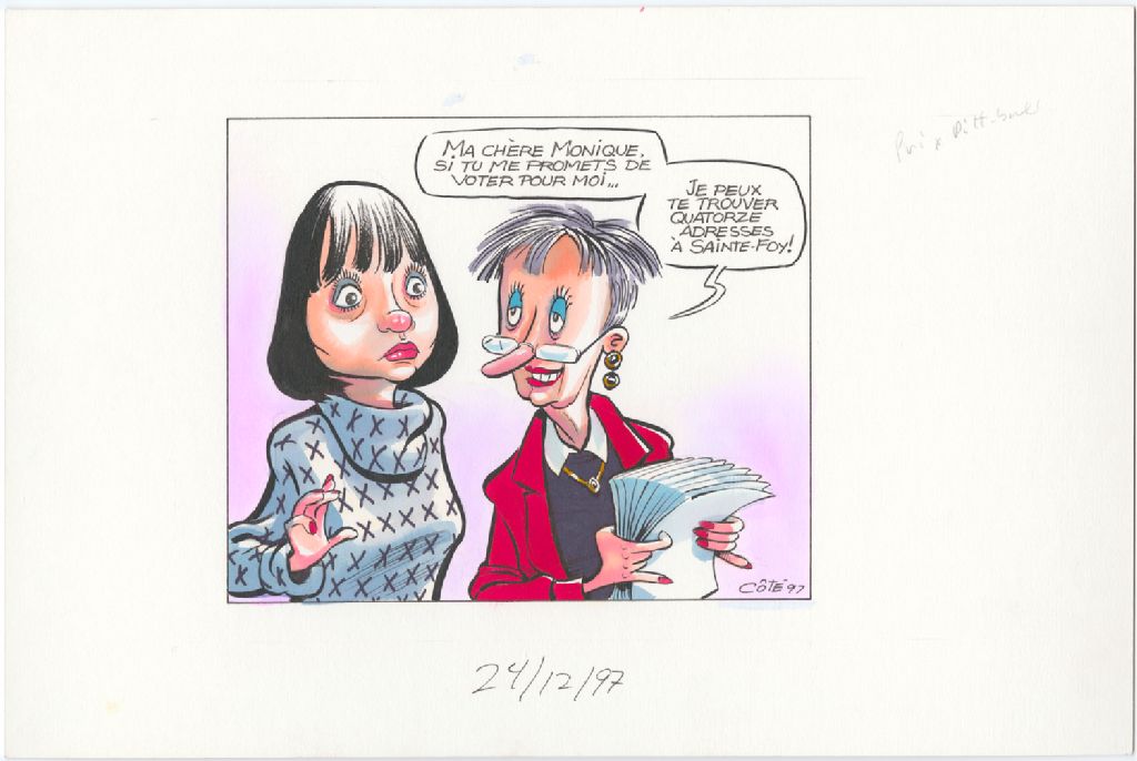 [Andrée Boucher] : "Ma chère Monique, si tu me promets de voter pour moi… Je peux te trouver quatorze adresses à Sainte-Foy!"