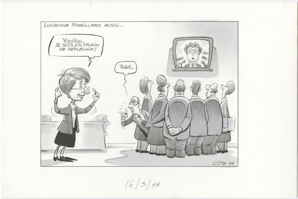 [Lucienne Robillard] : « Youhou… je suis en train de réfléchir ! » [Homme] : « Tchut... » [Plusieurs personnes regarde Jean Charest à la télévision], 16 mars 1998, Archives nationales à Québec, Fonds André-Philippe Côté, (03Q,P687,S1,P98-03-16), André-Philippe Côté.