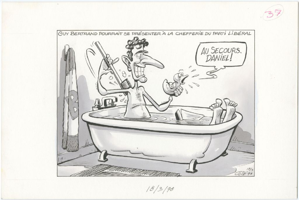 Guy Bertrand pourrait se présenter à la chefferie du Parti libéral [Guy Bertrand se lave dans un bain et tient un canard] [Canard] : « Au secours Daniel ! »