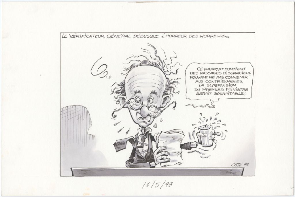 Le Vérificateur général débusque l'horreur des horreurs… "Ce rapport contient des passages disgracieux pouvant ne pas convenir aux contribuables, la supervision du Premier ministre serait souhaitable!", 16 mai 1998, Archives nationales à Québec, Fonds André-Philippe Côté, (03Q,P687,S1,P98-05-16-1), André-Philippe Côté.
