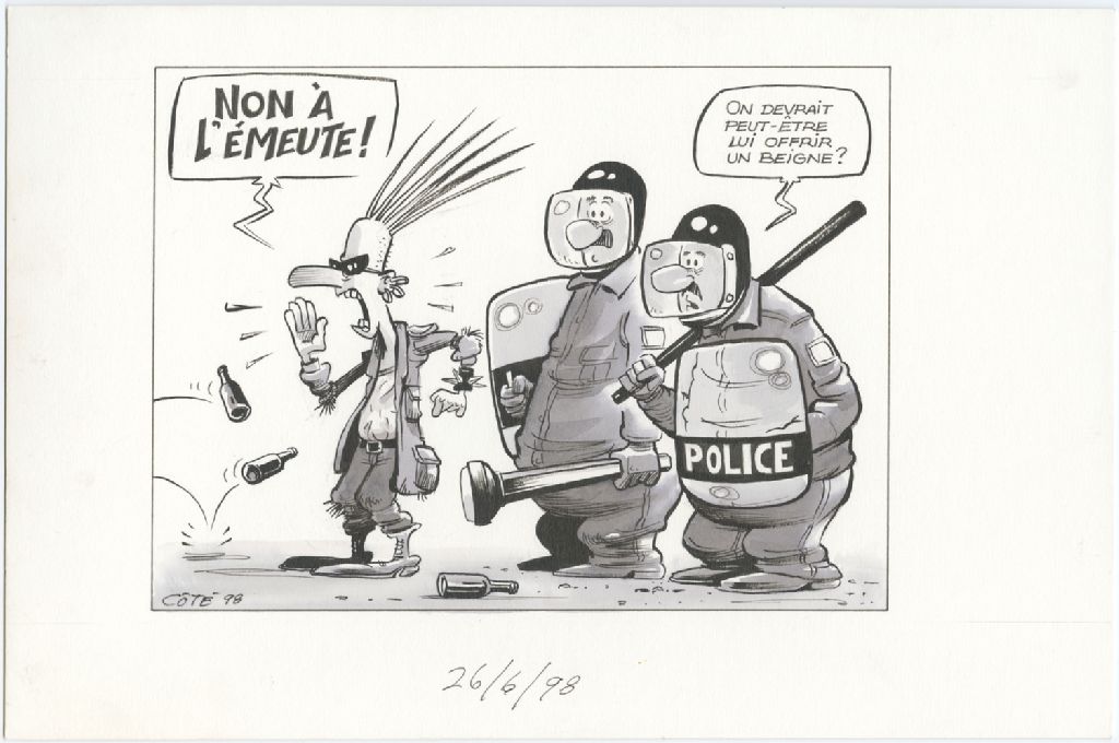 [Punk] : « Non à l'émeute ! » [Police antiémeute] : « On devrait peut-être lui offrir un beigne ? »