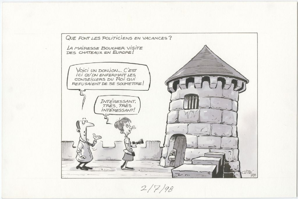 Que font les politiciens en vacances ? La maîresse Boucher visite des châteaux en Europe ! [Guide touristique] : « Voici un donjon… c'est ici qu'on enfermait les conseillers du Roi qui refusaient de se soumettre ! » [Andrée Boucher] : « Intéressant, très, très intéressant ! »