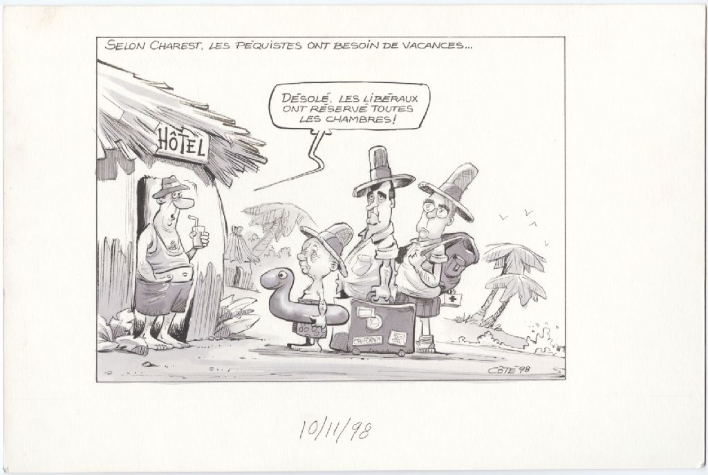 Selon Charest, les péquistes ont besoin de vacances… [Touriste] : « Désolé, les libéraux ont réservé toutes les chambres ! », 10 novembre 1998, Archives nationales à Québec, Fonds André-Philippe Côté, (03Q,P687,S1,P98-11-10-1), André-Philippe Côté.