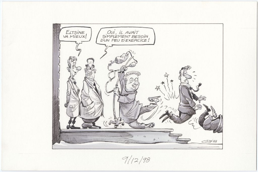 [Médecin 1] : « Eltsine va mieux ! » [Médecin 2] : « Oui, il avait simplement besoin d'un peu d'exercice ! » [Boris Eltsine botte le derrière de deux hommes]