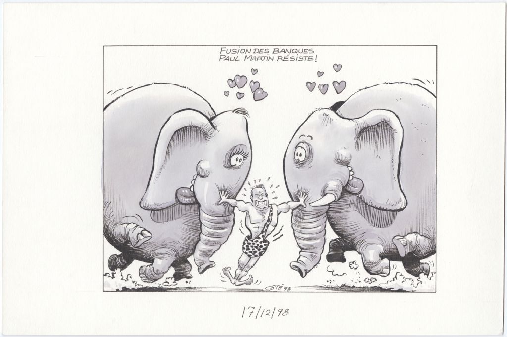 Fusion des banques. Paul Martin résiste ! [Paul Martin est déguisé en tarzan et repousse deux éléphants]