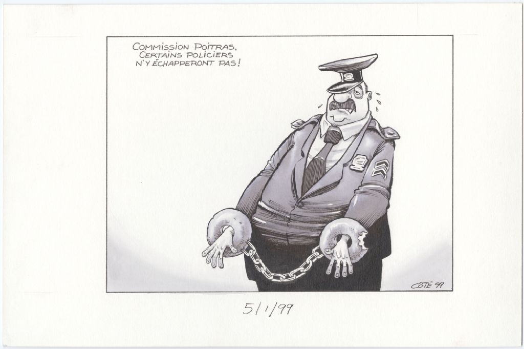 Commission Poitras, certains policiers n'y échapperont pas ! [Un policier est menotté avec des beignes], 5 janvier 1999, Archives nationales à Québec, Fonds André-Philippe Côté, (03Q,P687,S1,P99-01-05-1), André-Philippe Côté.