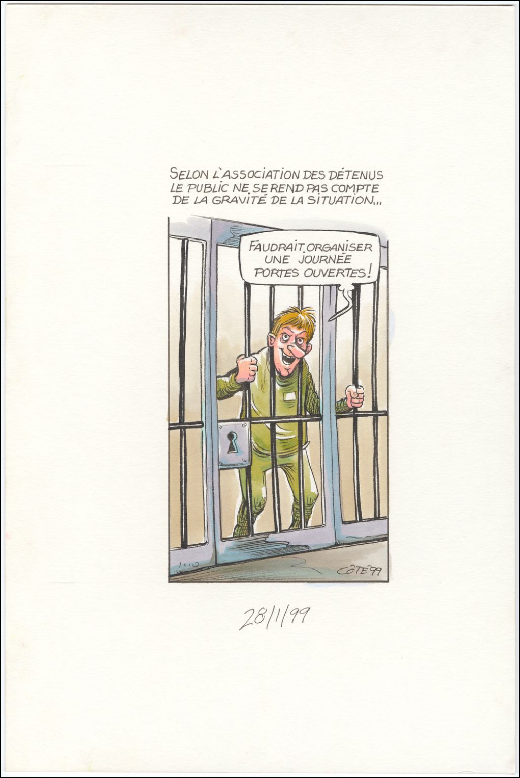 Selon l'Association des détenus le public ne se rend pas compte de la gravité de la situation… [Détenu] : « Faudrait organiser une journée portes ouvertes ! », 28 janvier 1999, Archives nationales à Québec, Fonds André-Philippe Côté, (03Q,P687,S1,P99-01-28), André-Philippe Côté.