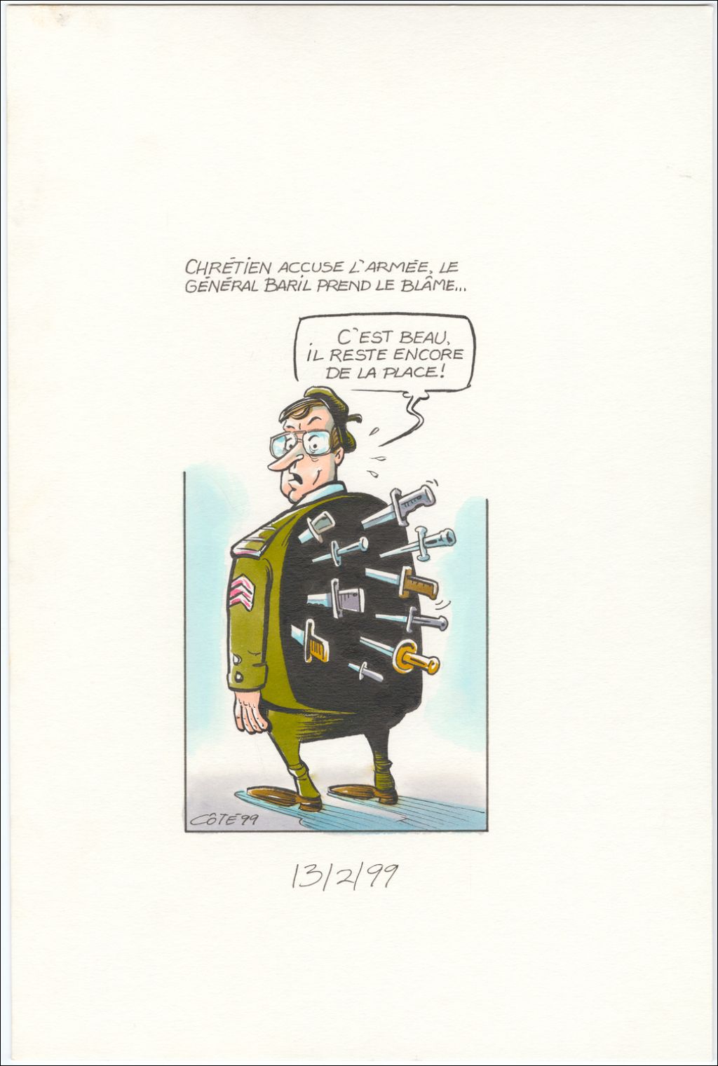 Chrétien accuse l'armée, le Général Baril prend le blâme… [Général Baril] : « C'est beau, il reste encore de la place ! », 13 février 1999, Archives nationales à Québec, Fonds André-Philippe Côté, (03Q,P687,S1,P99-02-13), André-Philippe Côté.