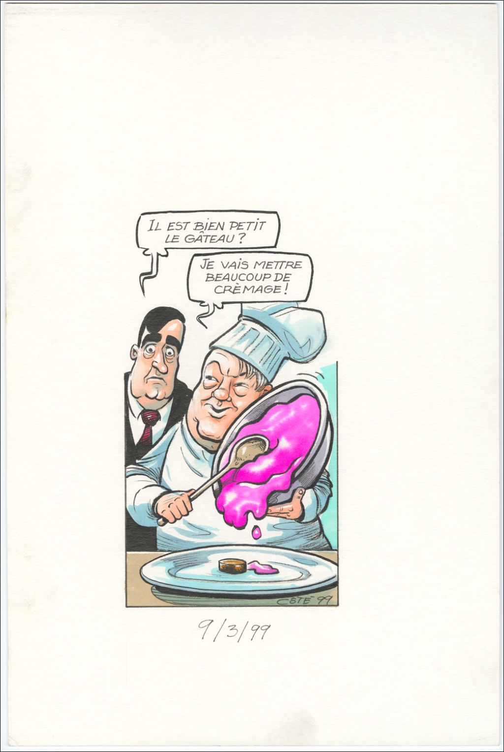 [Lucien Bouchard] : « Il est bien petit le gâteau ? » [Bernard Landry] : « Je vais mettre beaucoup de crémage ! », 9 mars 1999, Archives nationales à Québec, Fonds André-Philippe Côté, (03Q,P687,S1,P99-03-09), André-Philippe Côté.