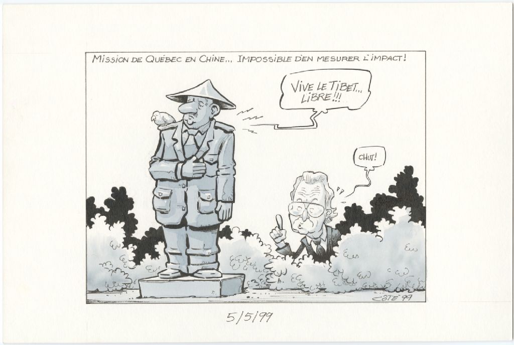 Mission de Québec en Chine… Impossible d'en mesurer l'impact ! [Statue de Charles De Gaulle] : « Vive le Tibet… libre !!! » [Jean-Paul L'Allier] : « Chut ! », 5 mai 1999, Archives nationales à Québec, Fonds André-Philippe Côté, (03Q,P687,S1,P99-05-05-1), André-Philippe Côté.
