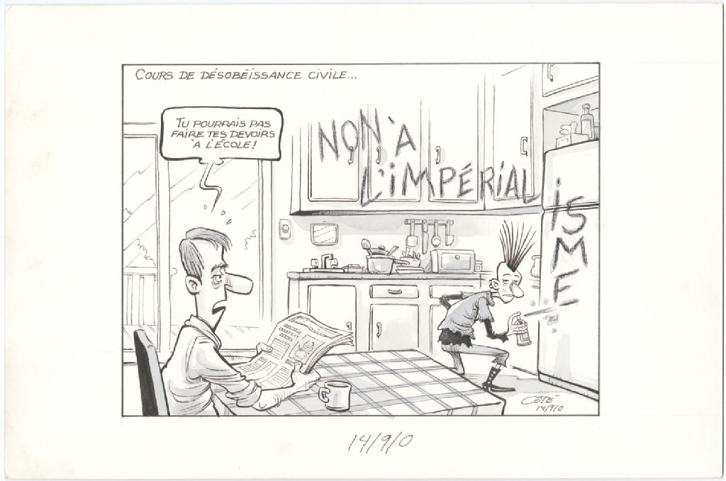 Cours de désobéissance civile… [Père de famille] : « Tu pourrais pas faire tes devoirs à l'école ! », 14 septembre 2000, Archives nationales à Québec, Fonds André-Philippe Côté, (03Q,P687,S1,P2000-09-14-1), André-Philippe Côté.