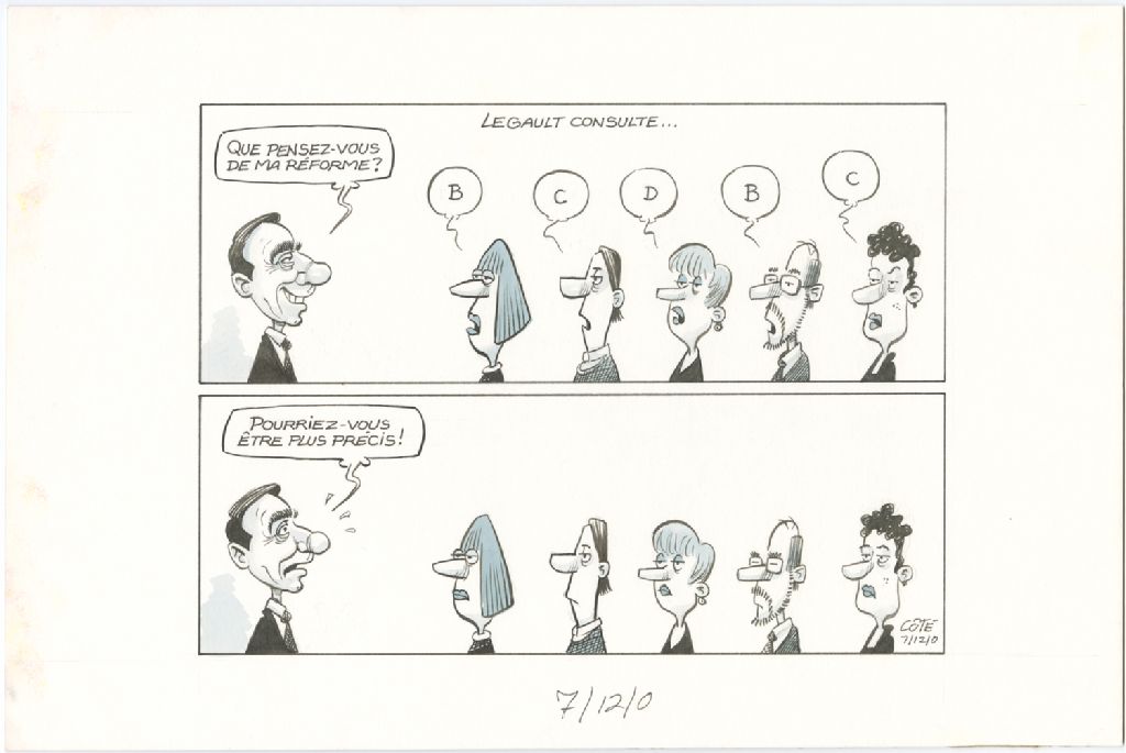 Sur le premier dessin Legault demande "Que pensez-vous de ma réforme?"-"B"-"C"-"D"-"B"-"C"Sur le deuxième dessin Legault demande "Pourriez-vous être plus précis!", mais n'obtient pas de réponse