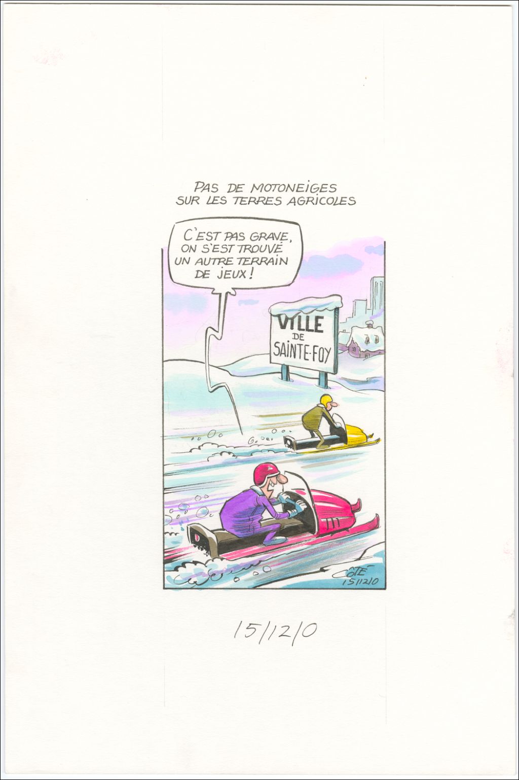 Pas de motoneiges sur les terres agricoles. [Motoneigiste] : "C'est pas grave, on s'est trouvé un autre terrain de jeux!", 15 décembre 2000, Archives nationales à Québec, Fonds André-Philippe Côté, (03Q,P687,S1,P2000-12-15), André-Philippe Côté.