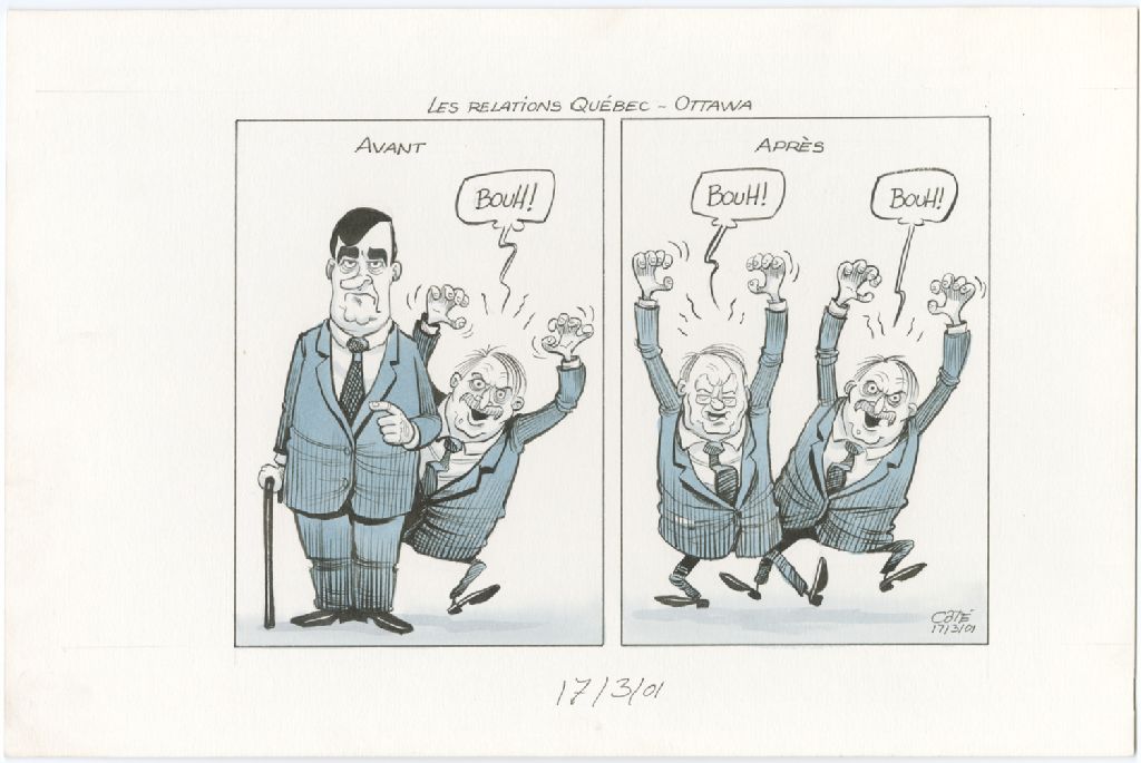Les relations Québec-Ottawa. Avant. [Lucien Bouchard et Jacques Parizeau] Après. [Bernard Landry et Jacques Parizeau], 17 mars 2001, Archives nationales à Québec, Fonds André-Philippe Côté, (03Q,P687,S1,P2001-03-17-1), André-Philippe Côté.