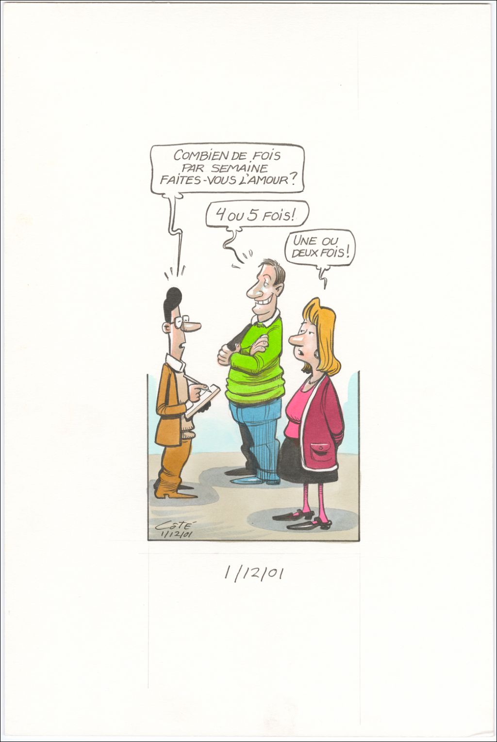 [Homme] : « Combien de fois par semaine faites-vous l'amour ? » [Mari] : « 4 ou 5 fois ! » [Femme] : « Une ou deux fois ! »