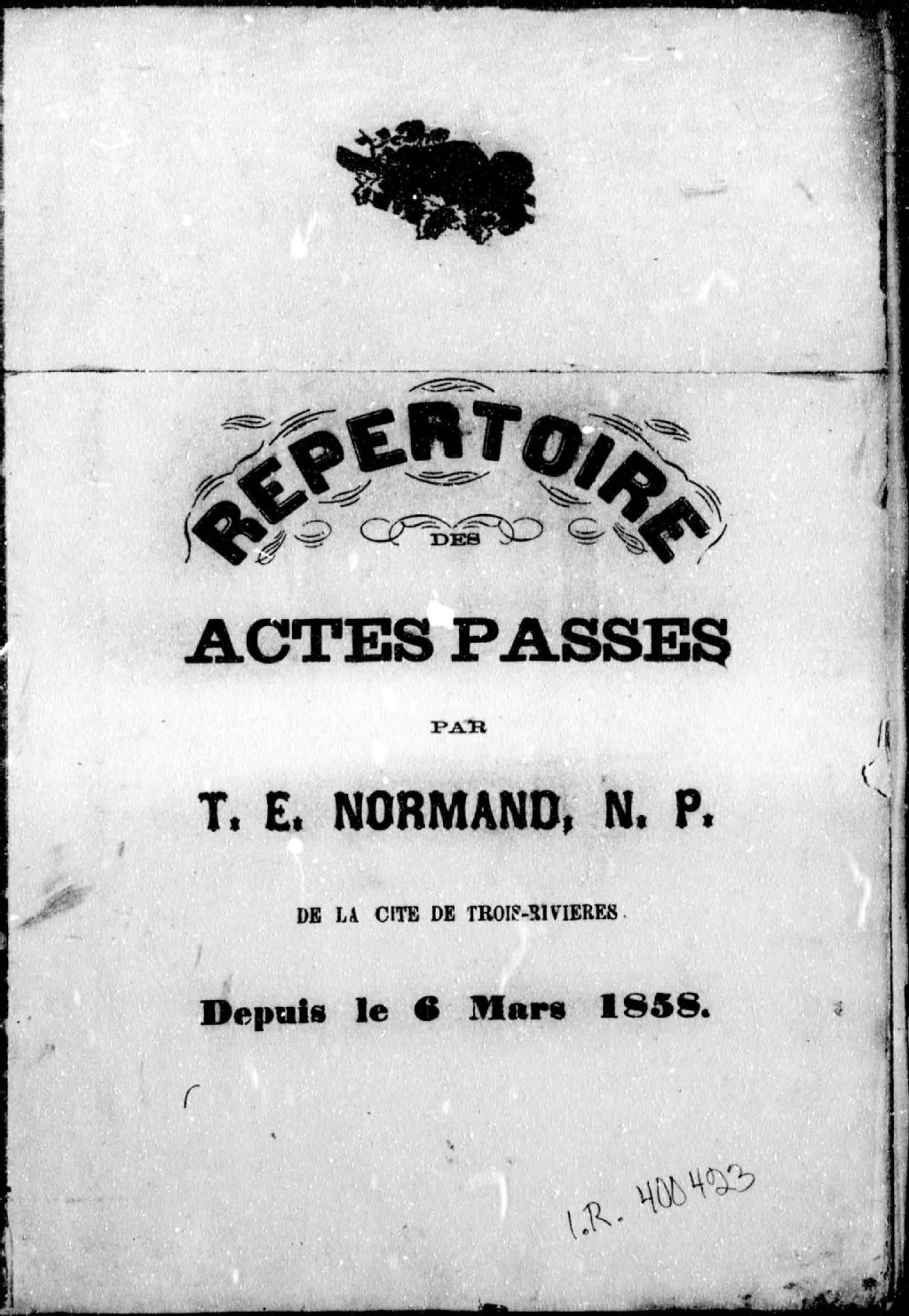 - Cette série regroupe 5753 minutes notariales du greffe de Eusèbe-Télésphore Normand ainsi qu'un répertoire chronologique en 3 volumes. Les minutes sont numérotées de 1 à 3742 entre 1858 et 1900. Celles portant les numéros suivants sont manquantes: 117, 450, 769, 822, 900, 1089, 1177, 1602, 1955, 2021, 2138, 2199, 3363, 3340 et 3341; tandis que les numéros suivants ont été omis dans la séquence : 602, 831-837, 842, 843, 1360, 1373, 1411, 1581, 1751, 1761, 1847, 1868, 1901, 1944, 1997, 2076, 2078, 2135, 2196, 2171, 2288, 2536, 2537, 2562, 2691, 2734, 2736, 2737, 2746, 2750, 2756, 2770, 2771, 2775, 2785, 2799, 2819, 2844, 2876, 2926, 2933, 2939-2941, 2952, 2984, 2988, 2999, 3013, 3021, 3022, 3044, 3064-3072, 3087, 3088, 3099, 3117-3119, 3124, 3130, 3146, 3152-3159, 3161, 3183-3187, 3189-3191, 3196-3198, 3215-3218, 3222-3226, 3234, 3244-3299, 3351, 3364, 3376, 3381, 3382, 3384, 3416, 3456, 3473, 3484, 3541, 3588, 3589, 3597, 3704, 3720, 3721. De 1901 à 1917, les minutes sont numérotées de 1 à 2011. Celles portant les numéros suivants sont manquantes : 637, 1084 et 1458; tandis que les numéros suivants ont été omis dans la séquence : 29, 85, 104, 196, 262, 379, 600, 790, 822, 831, 851, 1003, 1528 et 1642De 1858 à 1917, le notaire Normand a exercé à Trois-Rivières (du 6 mars 1858 au 29 octobre 1917)Prises dans leur ensemble, les données colligées dans ces documents officiels à contenu administratif et légal peuvent également constituer une source documentaire des plus révélatrices sur le mode et les conditions de vie de la population pendant cette période (métiers et professions mentionnés aux contrats, inventaires de biens, testaments), sur les classes sociales (mention de titres correspondant au rang social des parties concernées tels bourgeois, écuyer, etc), sur les moeurs et coutumes acceptées par la société et ses institutions (par le biais de déclarations, de jugement arbitral, d'injonctions, d'ordonnances, etc), et, dans une proportion moindre, sur la médecine d'époque et ses représentants.Enfin, la terminologie utilisée dans ces contrats notariés pourrait être avantageusement récupérée dans le cadre d'études portant sur l'évolution du langage administratif et légal, voire même sur l'évolution de la langue française