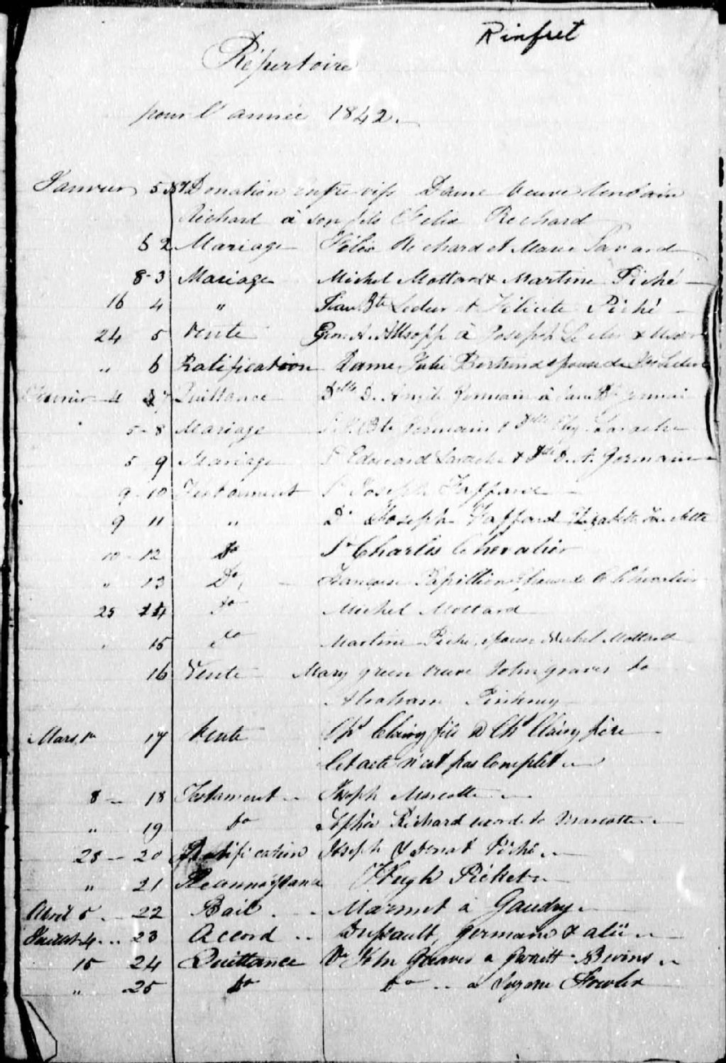- Cette série regroupe les minutes notariales du greffe de Élie Rinfret ainsi qu'un répertoire chronologique. Les minutes sont numérotées de 1 à 1960. Il n'y a aucune minute entre le 5 novembre 1847 et le 19 février 1854.De 1842 à 1878, le notaire Rinfret a exercé successivement à Cap-Santé (du 5 janvier 1842 au 5 novembre 1847), dans la seigneurie de Batiscan (du 19 février 1854 au 29 novembre 1854) et à Saint-Stanislas (du 6 décembre 1854 au 9 mai 1878).Prises dans leur ensemble, les données colligées dans ces documents officiels à contenu administratif et légal peuvent constituer une source documentaire des plus révélatrices sur le mode et les conditions de vie de la population pendant cette période (métiers et professions mentionnés aux contrats, inventaires de biens, testaments), sur les classes sociales (mention de titres correspondant au rang social des parties concernées tels bourgeois, écuyer, etc), sur les moeurs et coutumes [...]