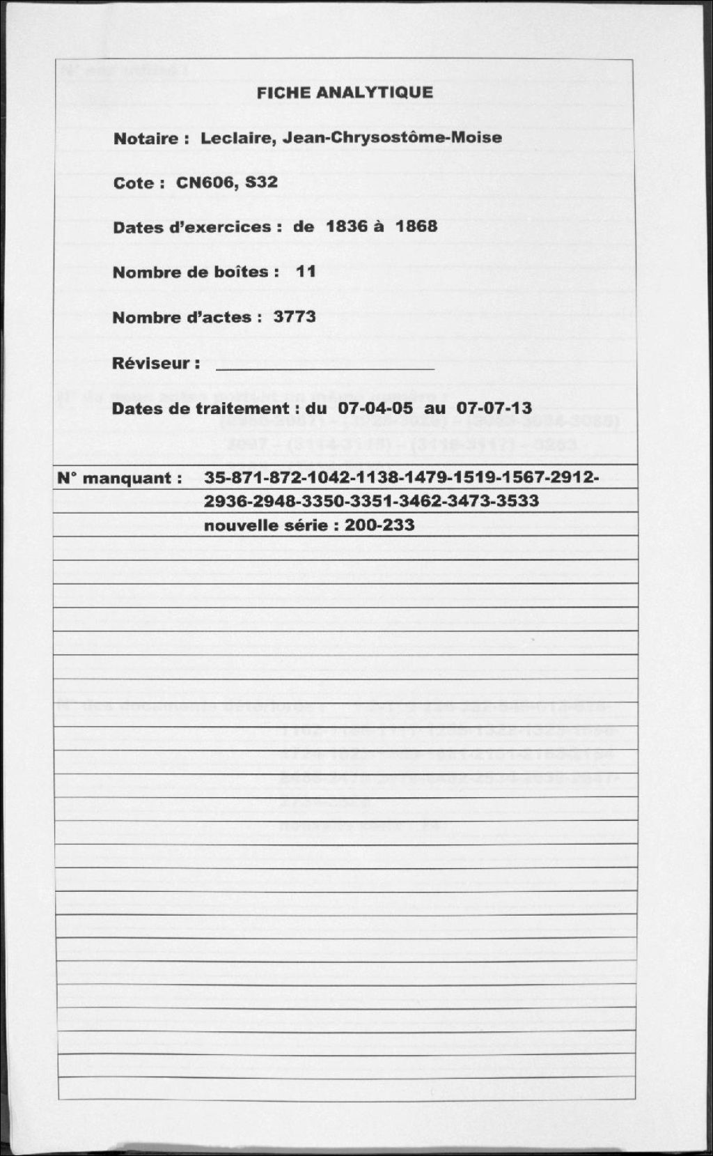 Jean-Chrysostôme-Moïse Leclaire, 1836-1868, Archives nationales à Montréal, Fonds Cour supérieure. District judiciaire de Terrebonne. Greffes de notaires, (06M,CN606,S32).