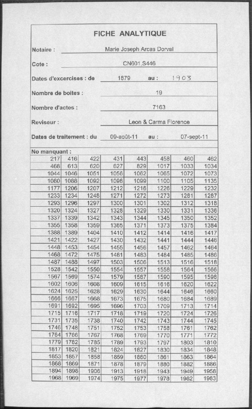 Marie Joseph Arcas Dorval, 1879-1903, Archives nationales à Montréal, Fonds Cour supérieure. District judiciaire de Montréal. Greffes de notaires, (06M,CN601,S446).