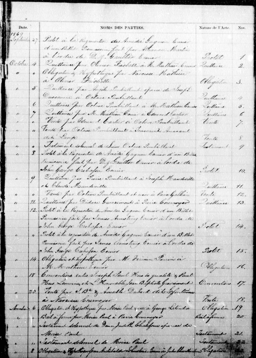 Louis-Désiré-Eusèbe Cartier, 1869-1887, Archives nationales à Montréal, Fonds Cour supérieure. District judiciaire de Richelieu. Greffes de notaires, (06M,CN603,S18).