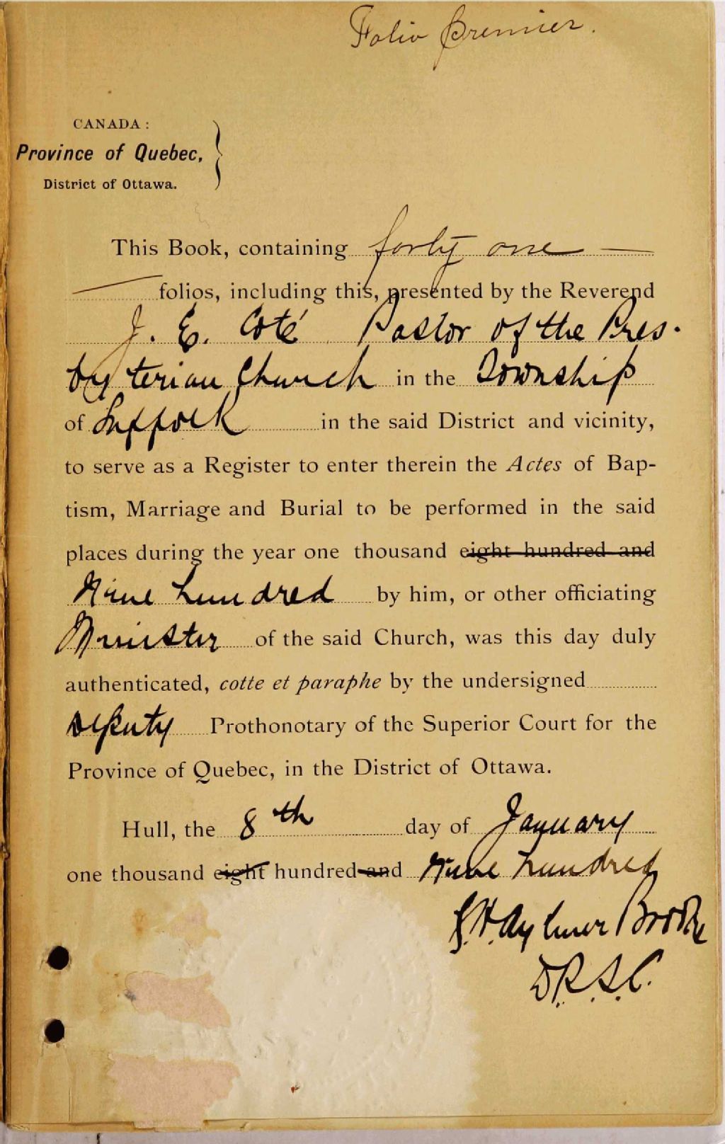 Namur Presbyterian Church, 1900-1921, Archives nationales à Gatineau, Fonds Cour supérieure. District judiciaire de Hull. État civil, (07H,CE701,S59).