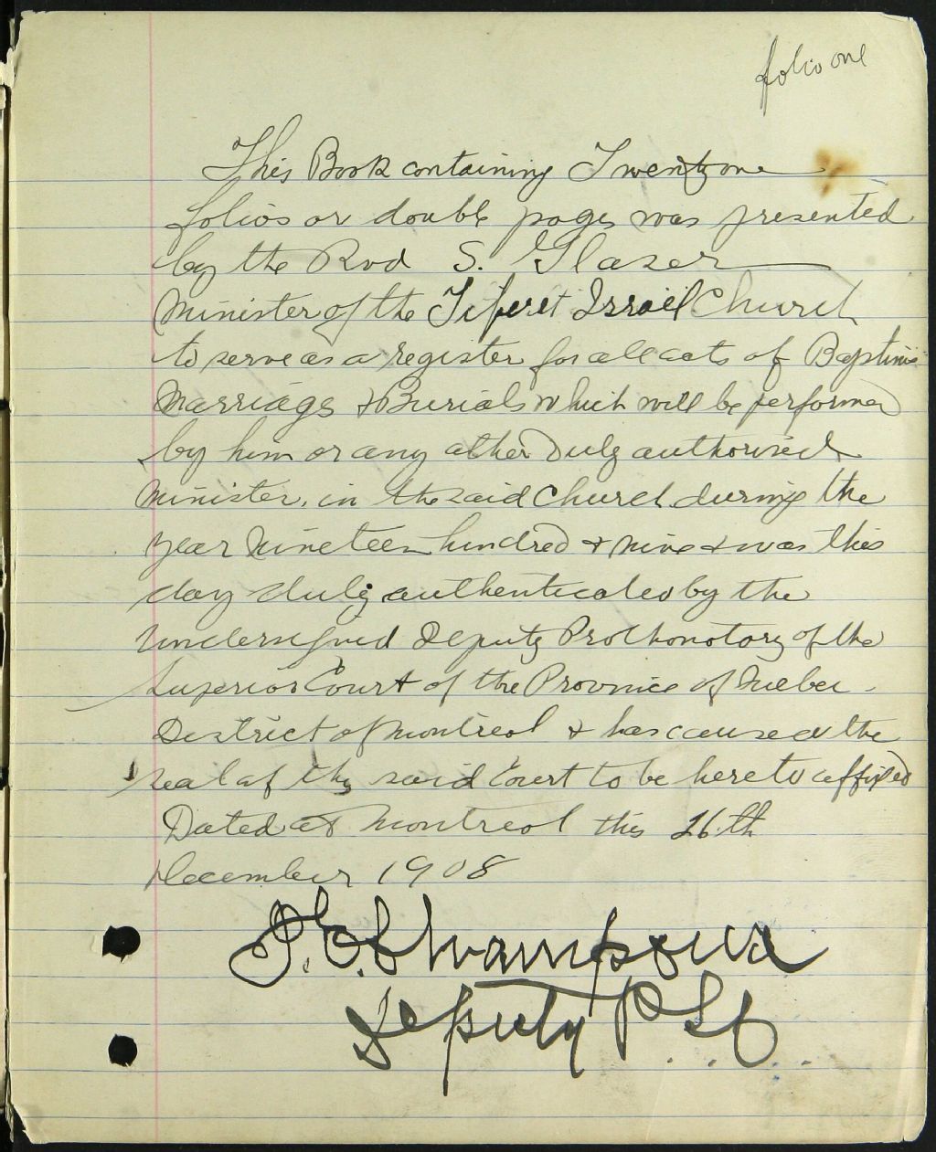 Tifereth Israel Synagogue, 1909-1920, Archives nationales à Montréal, Fonds Cour supérieure. District judiciaire de Montréal. État civil, (06M,CE601,S289).
