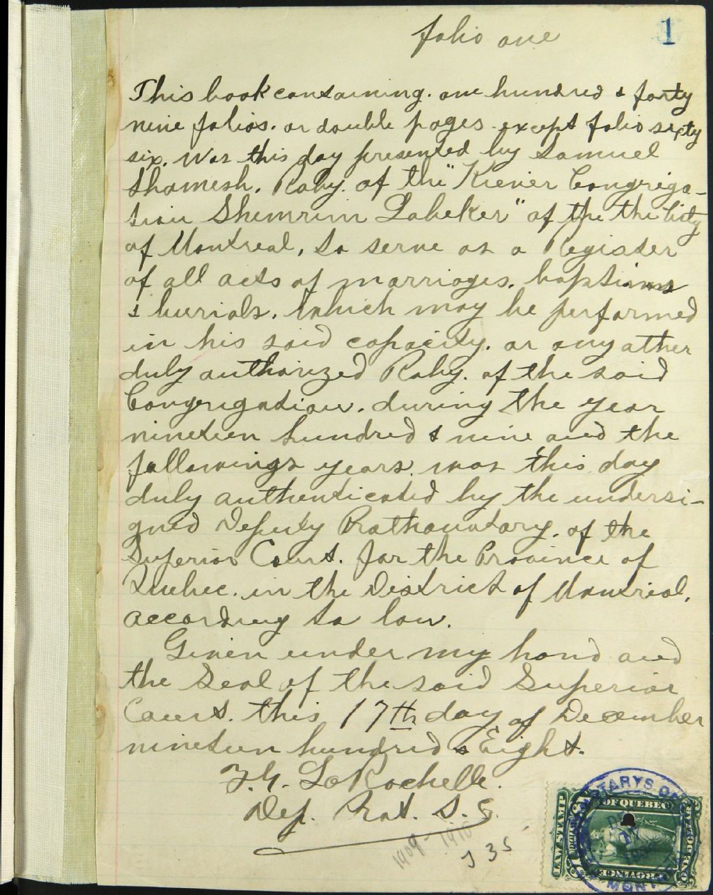 Kiever Shemerin Labeker Synagogue, 1909-1910, 1916-1922, Archives nationales à Montréal, Fonds Cour supérieure. District judiciaire de Montréal. État civil, (06M,CE601,S303).