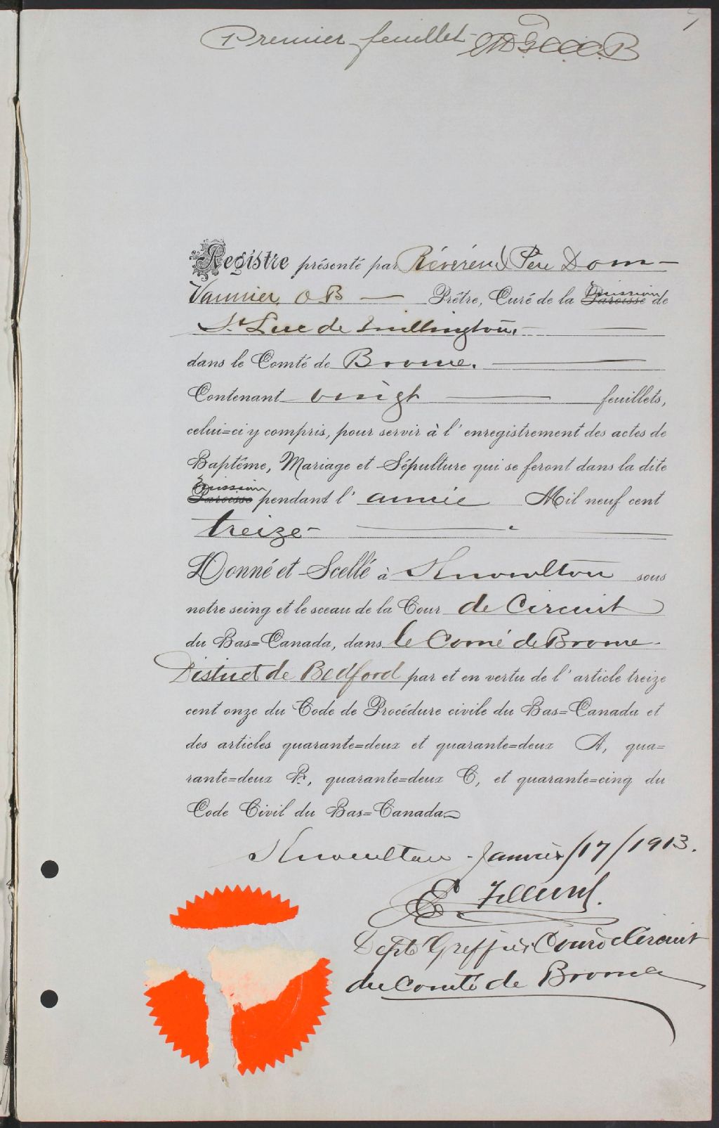 Mission de Saint-Luc-de-Millington, 1913-1921, Archives nationales à Montréal, Fonds Cour supérieure. District judiciaire de Bedford. État civil, (06M,CE611,S56).
