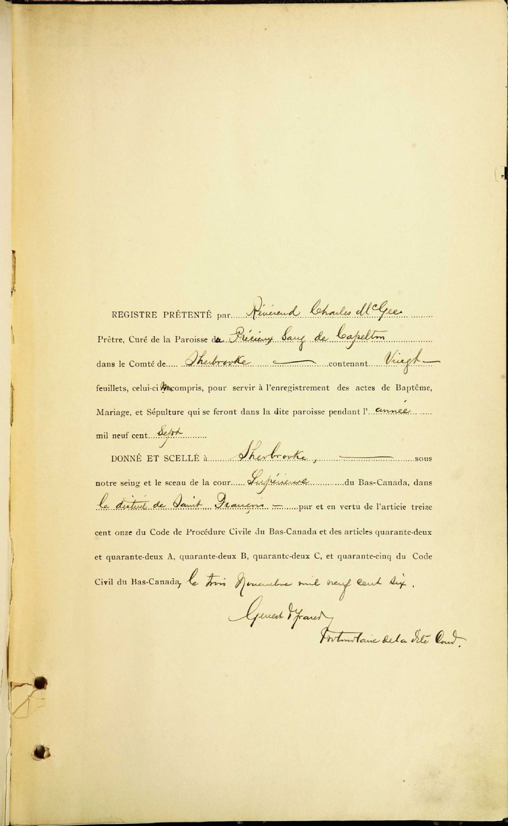 Cette série regroupe les registres originaux de l'état civil, lesquels contiennent les enregistrements de baptêmes, de mariages et de sépultures consignés par le curé ou son représentant desservant la communauté de confession catholique de la paroisse Précieux-Sang de Capelton. On retrouve également, en règle générale, un index nominatif à la fin de chaque registre.Pour 1883 et la fin de l¿année 1906 (après le 1er août), voir Saint-Antoine-de-Padoue (CE501,S5)