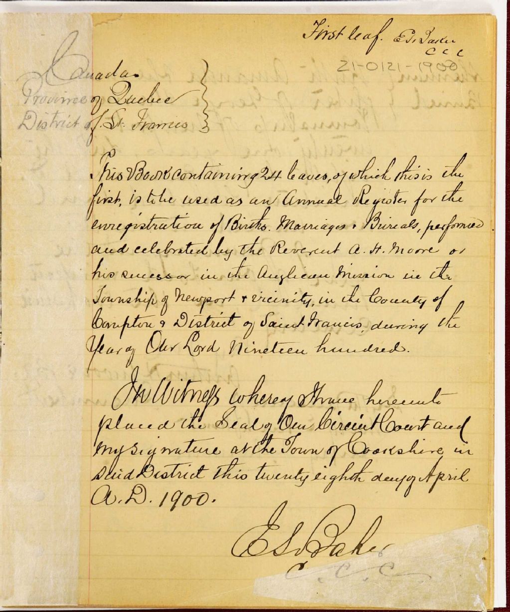 - La série regroupe un registre de l'état civil, lequel contien les enregistrements de baptêmes, de mariages et de sépultures consignés par le révérend ou son représentant de la Newport Anglican Mission. Voir aussi : CE501,S39 Saint Peter's Anglican Chruch of Cookshire et CE501,S165 Saint Phillip's Anglican Church of Sawyerville