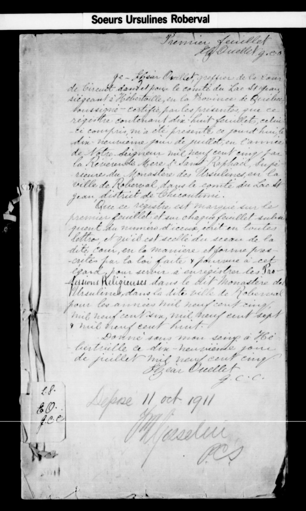 Soeurs Ursulines de Roberval, 1905-1908, Archives nationales à Saguenay, Fonds Cour supérieure. District judiciaire de Roberval. Etat civil, (02C,CE202,S7).