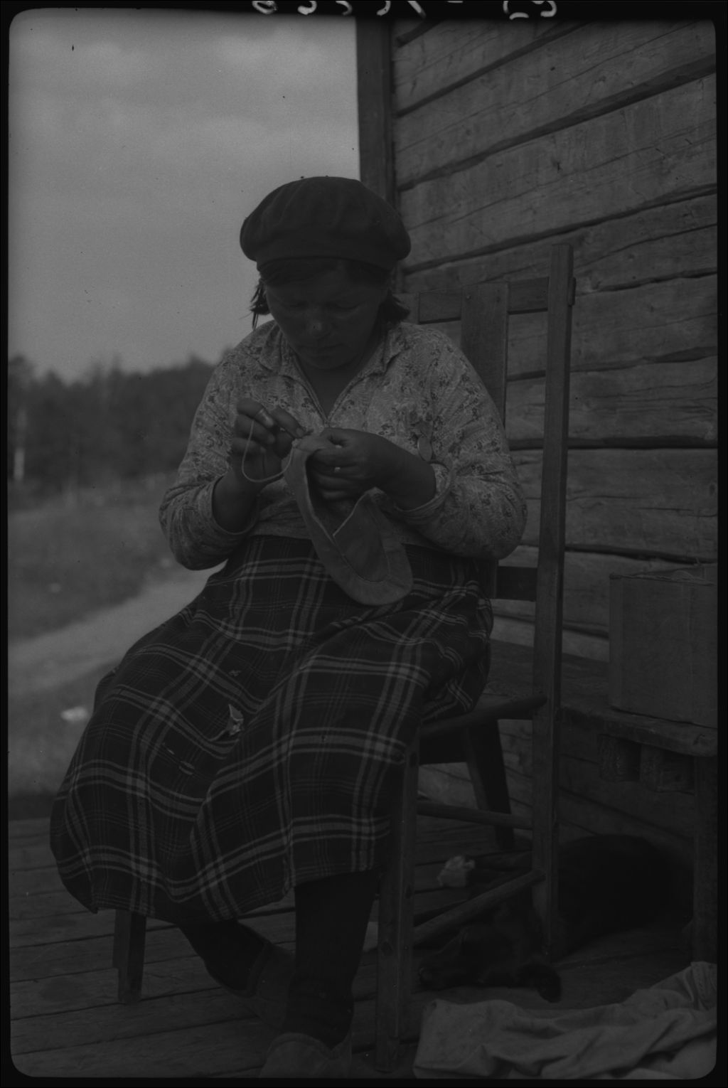 Indienne confectionnant des mocassins en peaux d'orignal. Réserve indienne de Manouane, 1947, Archives nationales à Québec, Fonds Ministère de la Culture et des Communications, (03Q,E6,S7,SS1,D2,P92326), J. Armand Tremblay.