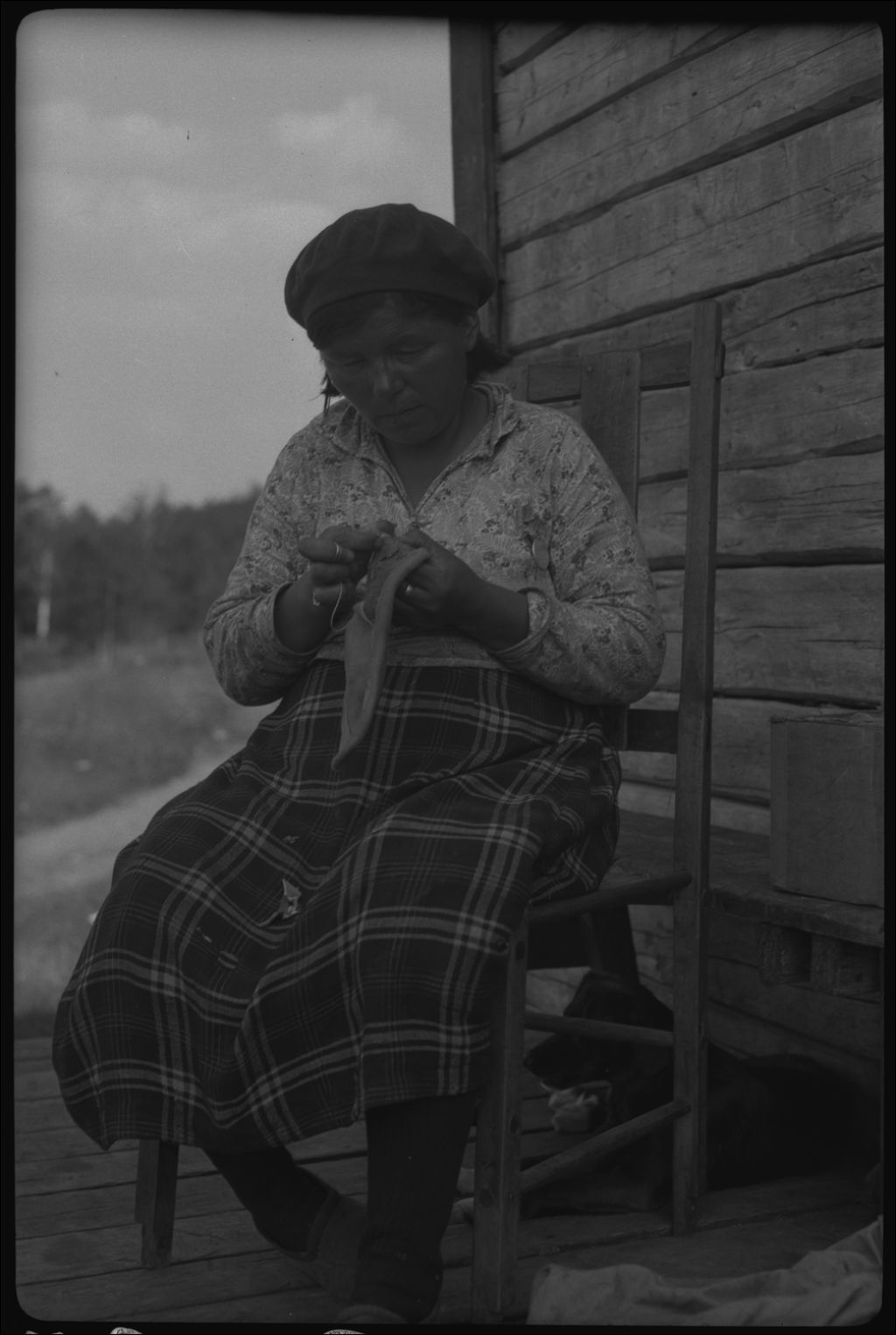 Indienne confectionnant des mocassins en peaux d'orignal. Réserve indienne de Manouane, 1947, Archives nationales à Québec, Fonds Ministère de la Culture et des Communications, (03Q,E6,S7,SS1,D2,P92327), J. Armand Tremblay.